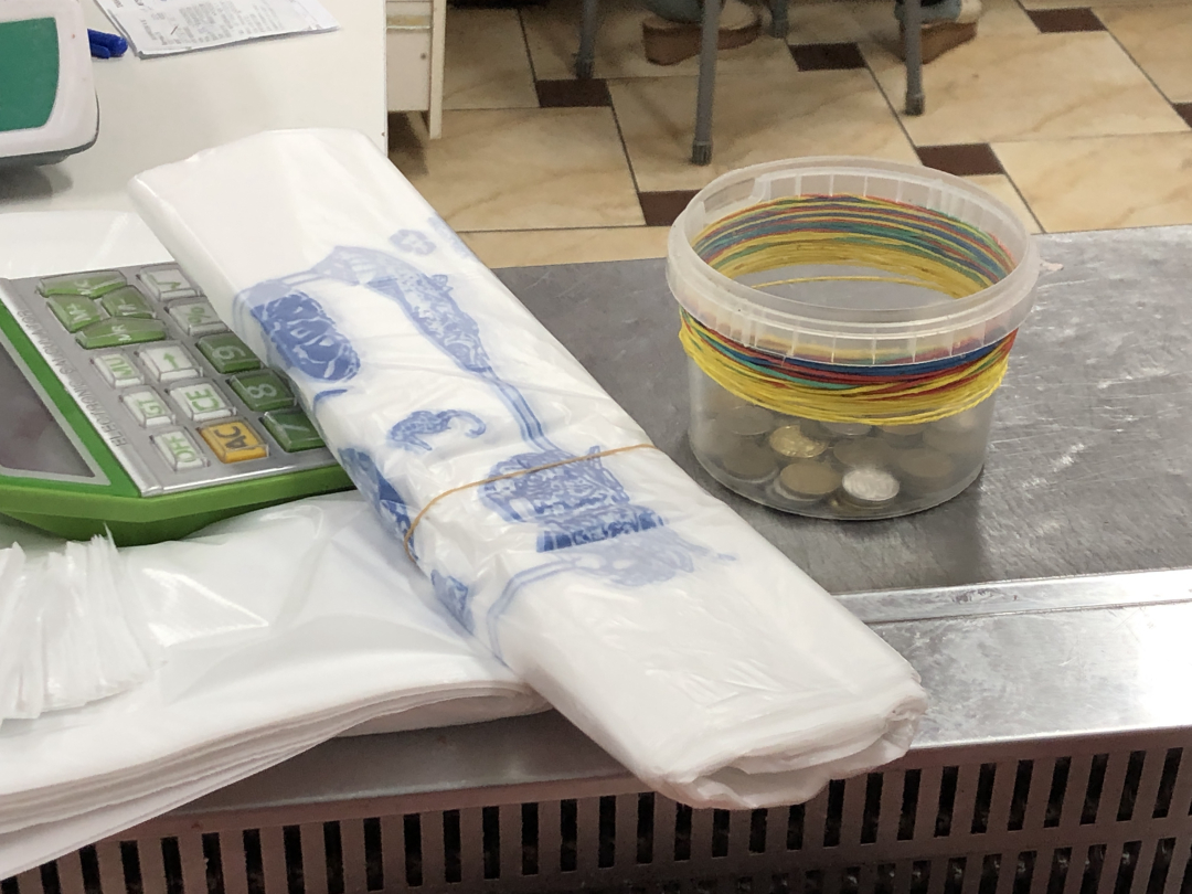 In the store, I got curious when I saw the plastic bucket with many colorful rubber bands around it. I was intrigued where they were coming from and what purpose they served in the meat section. I talked to the two ladies at the counter who shared that they [sales people] usually receive plastic bags with one rubber band around it to keep the bags together. This one lady collects the rubber bands instead of discarding them and uses them for various purposes. For example, she said rubber bands help calculators to stick their together when they get old and about to break. Another purpose she shared with me was using the plastic bands to bind cash, which is a more common usage.
