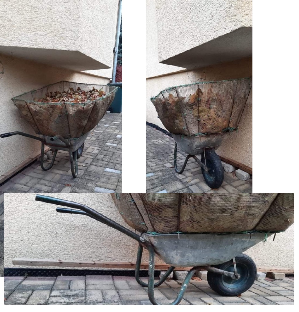 He described that, no longer he has animals, though only fruit trees, and in autumn there are many leaves in the garden. This old equipment was redesigned for the garden; he collects all the leaves and puts them here continuously. The equipment is able to move and come next the the trees, and then move it somewhere where the rain will not flood it.