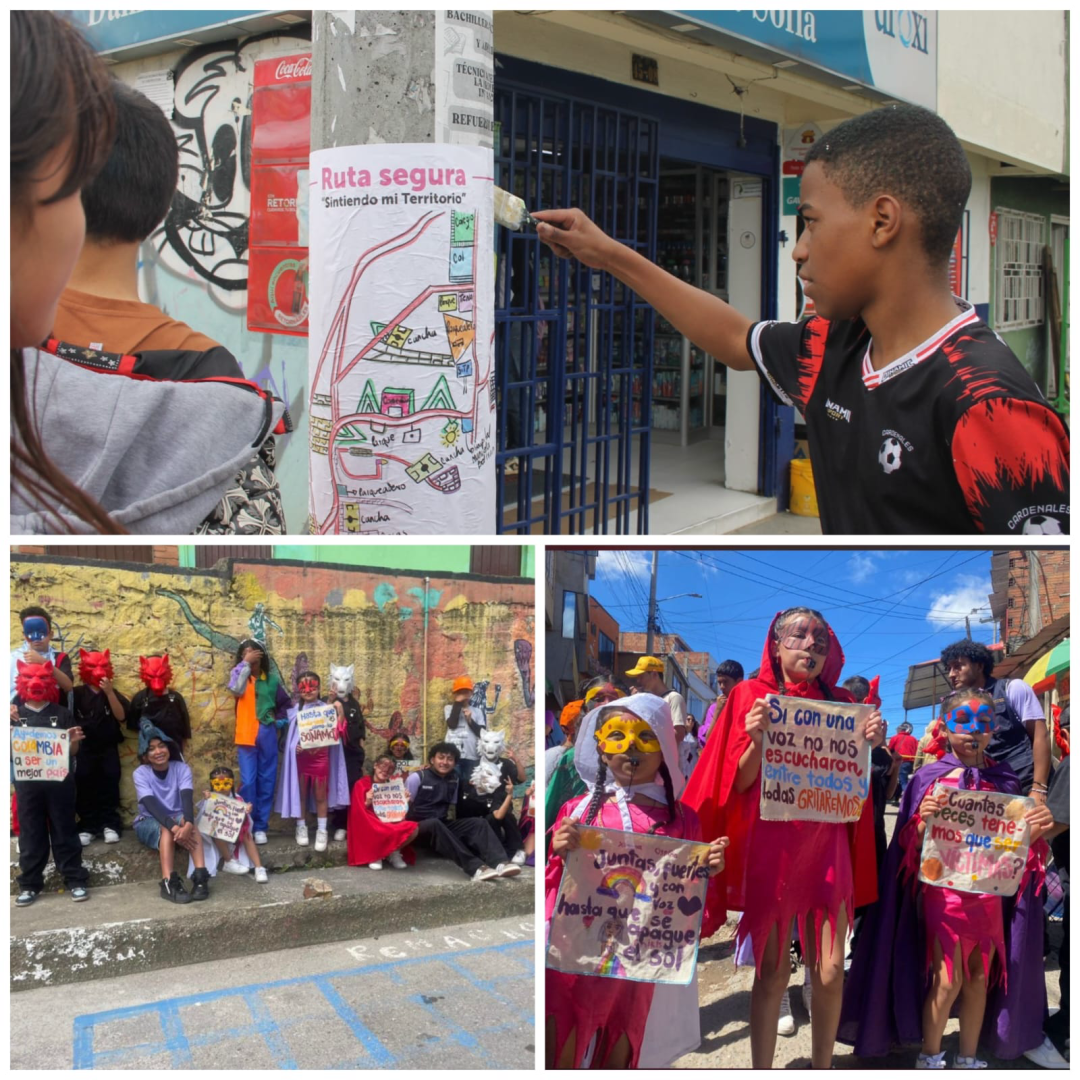 Las Rutas Seguras son trayectos por donde transitan diariamente los niños, niñas y adolescentes que asisten a Cuyeca para ir al colegio, a la organización o regresar a sus hogares. A lo largo de estos recorridos se intervienen puntos estratégicos mediante expresiones artísticas que buscan transformar la percepción del lugar, haciendo que la comunidad reconozca estos espacios como entornos vivos y significativos para la comunidad. Estas intervenciones favorecen la apropiación del espacio, generando conexiones afectivas y un sentido de pertenencia que se traduce en prácticas de cuidado colectivo. De esta manera, los recorridos dejan de ser simples vías de tránsito para convertirse en lugares valorados, donde las personas se sienten llamadas a proteger y acompañar la presencia de los niños, niñas y adolescentes en su vida cotidiana.